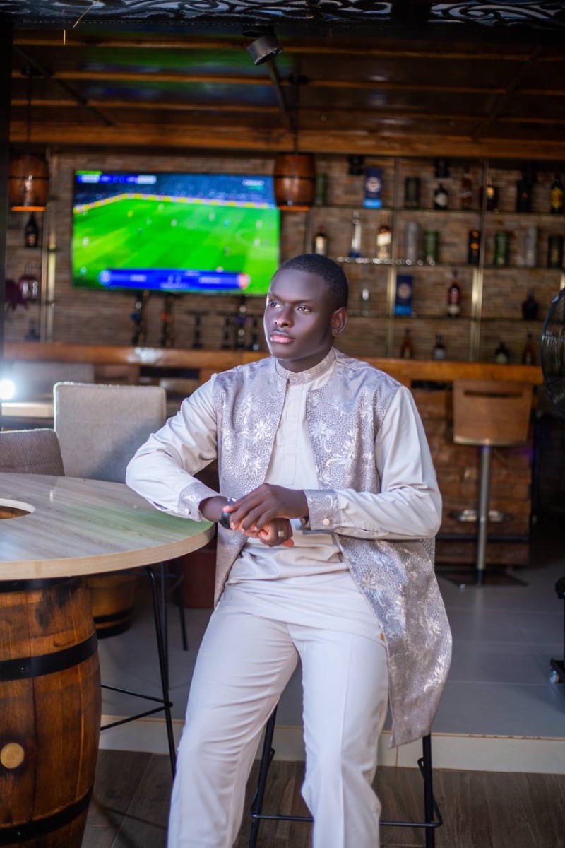 Tunique manches longue beige assortie d’un gilet à motifs doublé.